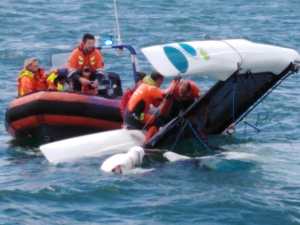 12h40 Arrivé sur zone, les 2 plongeurs montent sur le catamaran pour le retourner