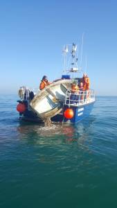 11h14 Arrivée de la SNS239 de Dives, on leur demande s’il est possible de la monter sur leur arrière au vu de l’état de cette barque. Ils la remontent sur leur bord en 2 minutes.