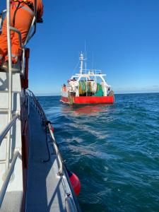 08h40. contact VHF avec le patron du chalutier signalons avoir 2 plongeurs SNB2 à bord pensons pouvoir investiguer l’hélice avant remorquage vers OUISTREHAM accord du cross et du chalutier