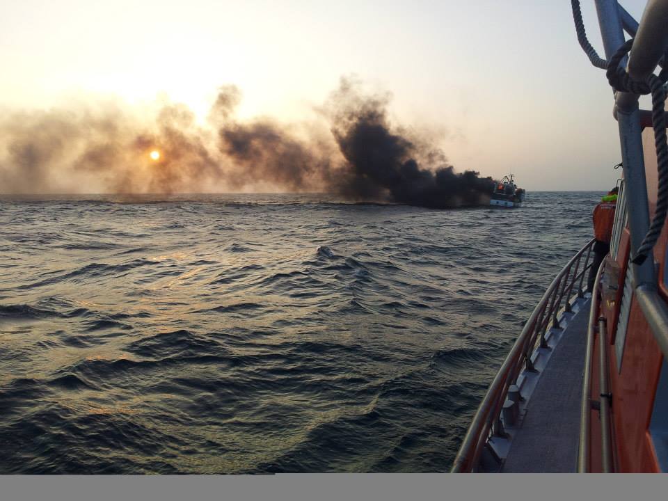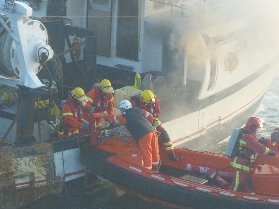 14h20 Les 2 marins pêcheurs sont récupérés par le SDIS, le navire André Malraux se dirige vers le chalutier pour commencer l’extinction