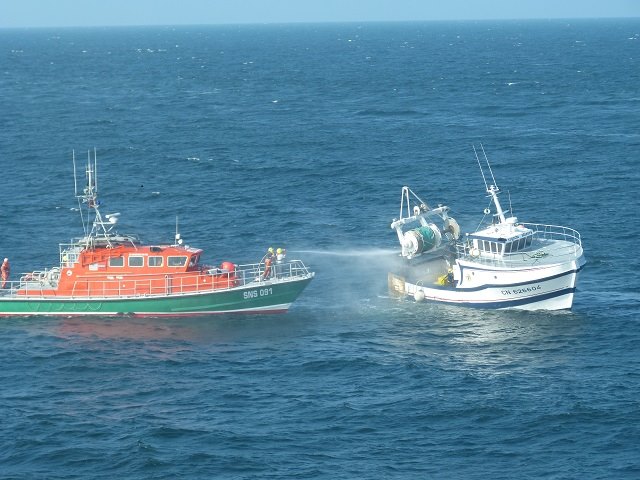 15h15 Arrivée sur zone, mise en route d’une lance à incendie de concert avec l’André Malraut (2 lances)Ordre de cross jobourg de ne pas monter sur le chalutier , risque d’explosion.CTT 091 OSC